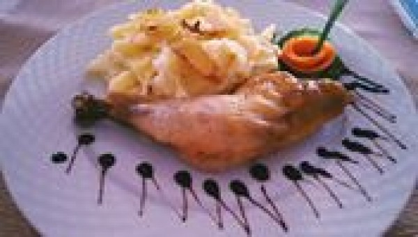 Cartofi gratinati cu sos Mornay si pulpe de pui la tava