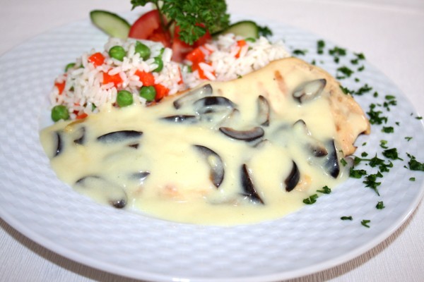 Piept de pui cu sos de ciupersci si orez cu legume